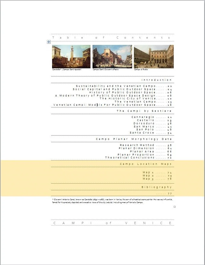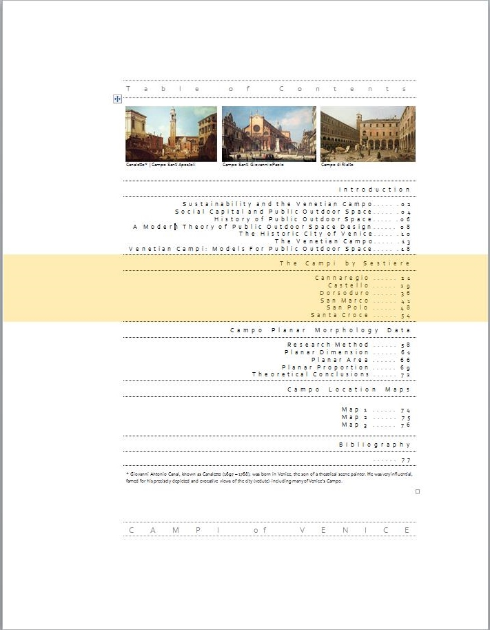 This research is concerned with urban public outdoor space and the identification and analysis of the planar spatial and morphological features which affect the social utility of that space. These design variables are examined through the physical analysis of a group of geographically concentrated Italian public outdoor spaces, the campi of Venice. A group of 67 Venetian campi is used as prototypical examples of those planar physical characteristics seen as fundamental to effective public outdoor space.