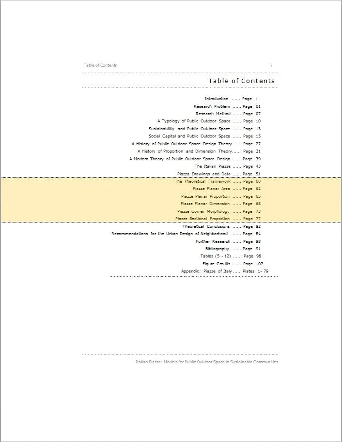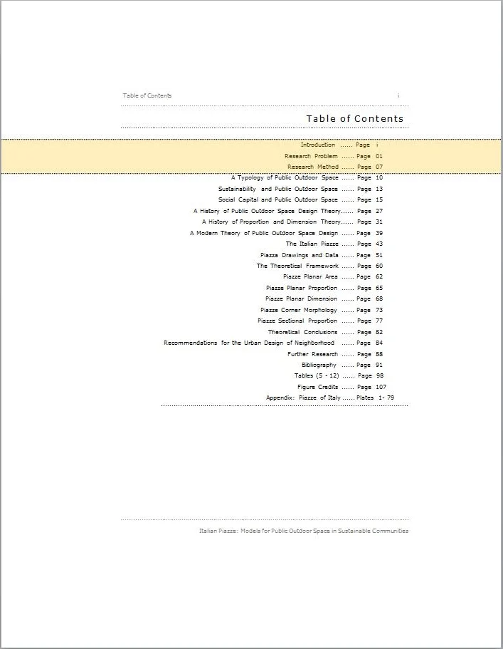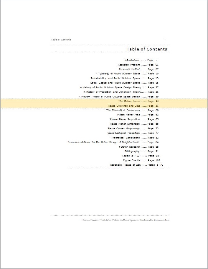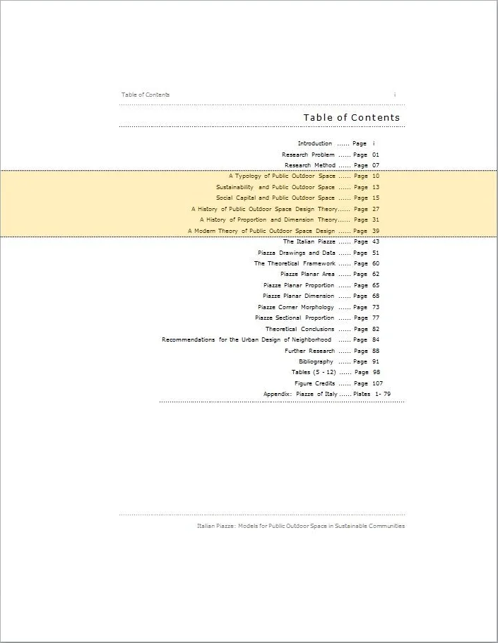 In order than the understanding of the Italian examples developed herein has a broader theoretical framework within which to be considered, a typology of public outdoor space is developed based on several attributes assigned to a limited number of forms existing in contemporary urban contexts. With that typology in place, a systematically selected sample of Italian piazze is used as prototypical of those physical characteristics seen as fundamental to effective public outdoor space within the piazza type.
